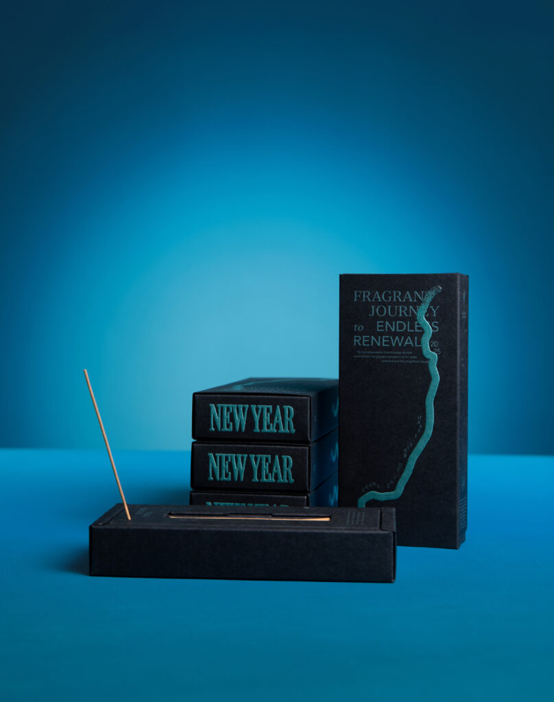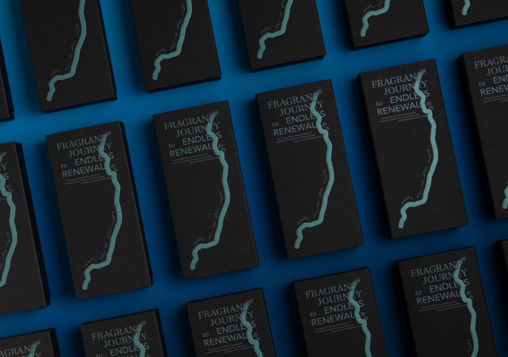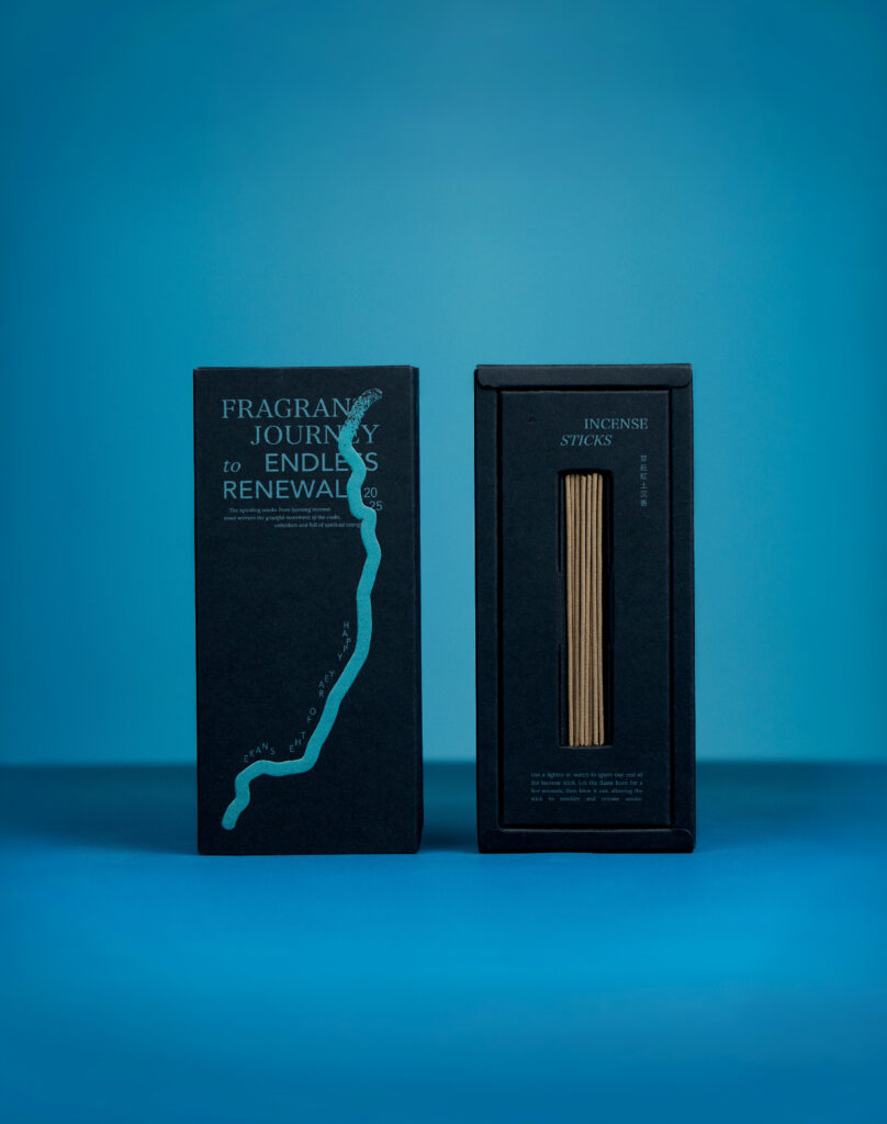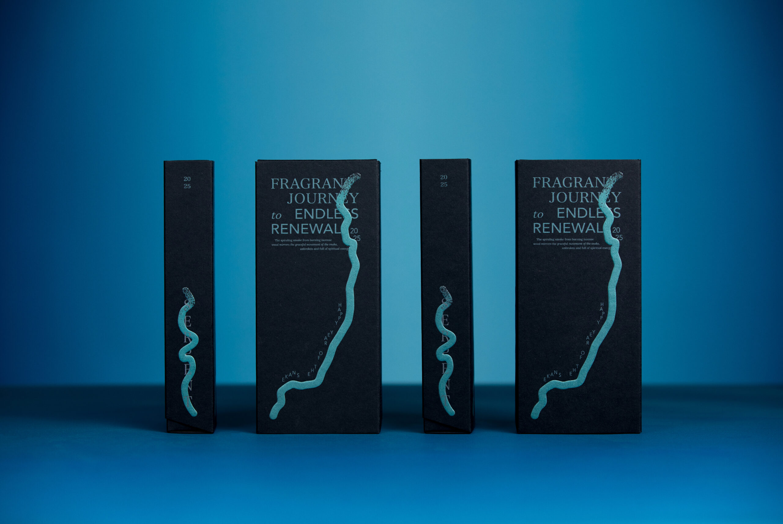 青藍色的色彩設定呼應著青蛇的樣貌,並以青色金屬油墨印製、打凸,增加了與「 恆成紙業_晨紙黑 」豐富紙質紋理的層次變化;蛇的形態以抽象的設計手法呈現,蛇體蜿蜒的圖案增添了更多聯想空間。