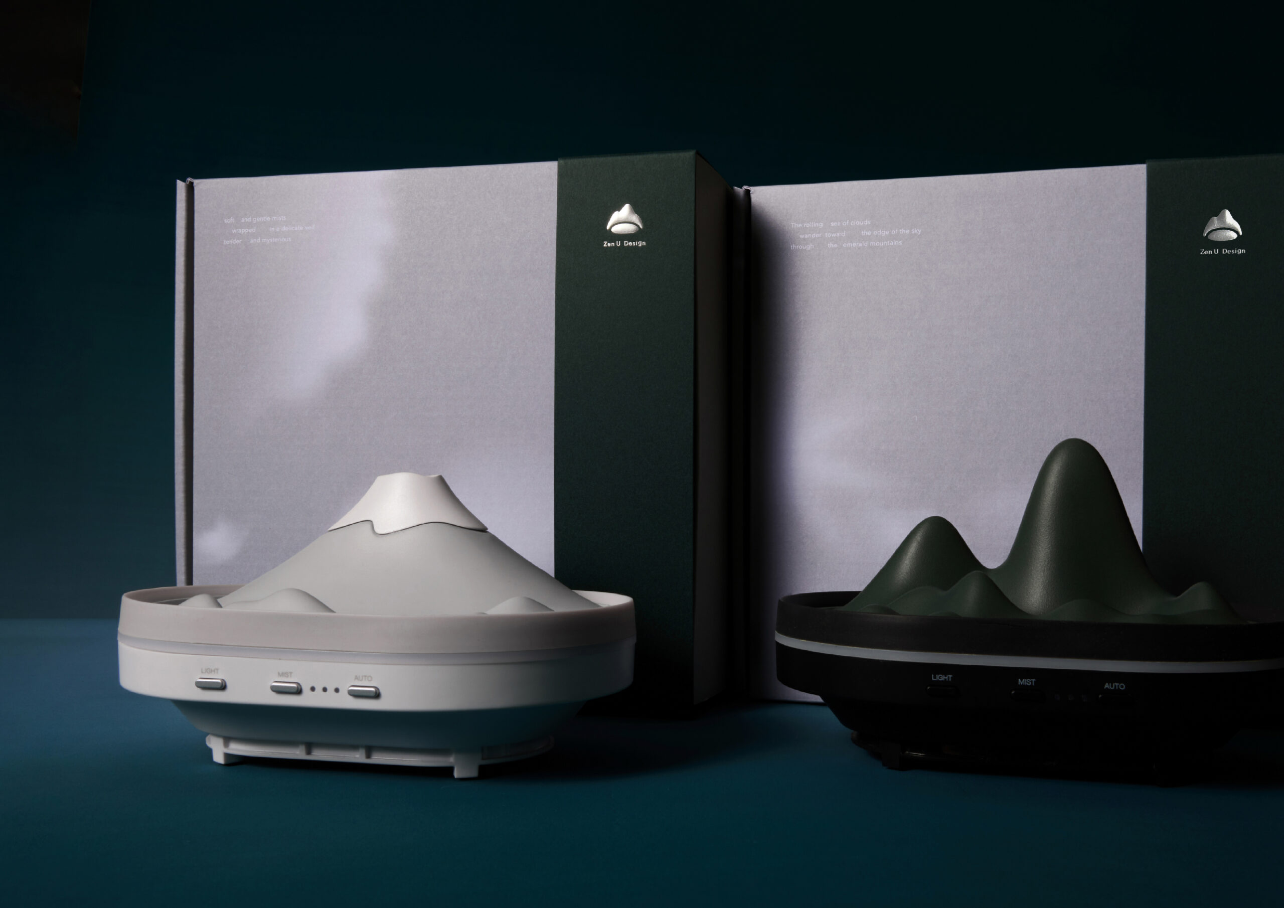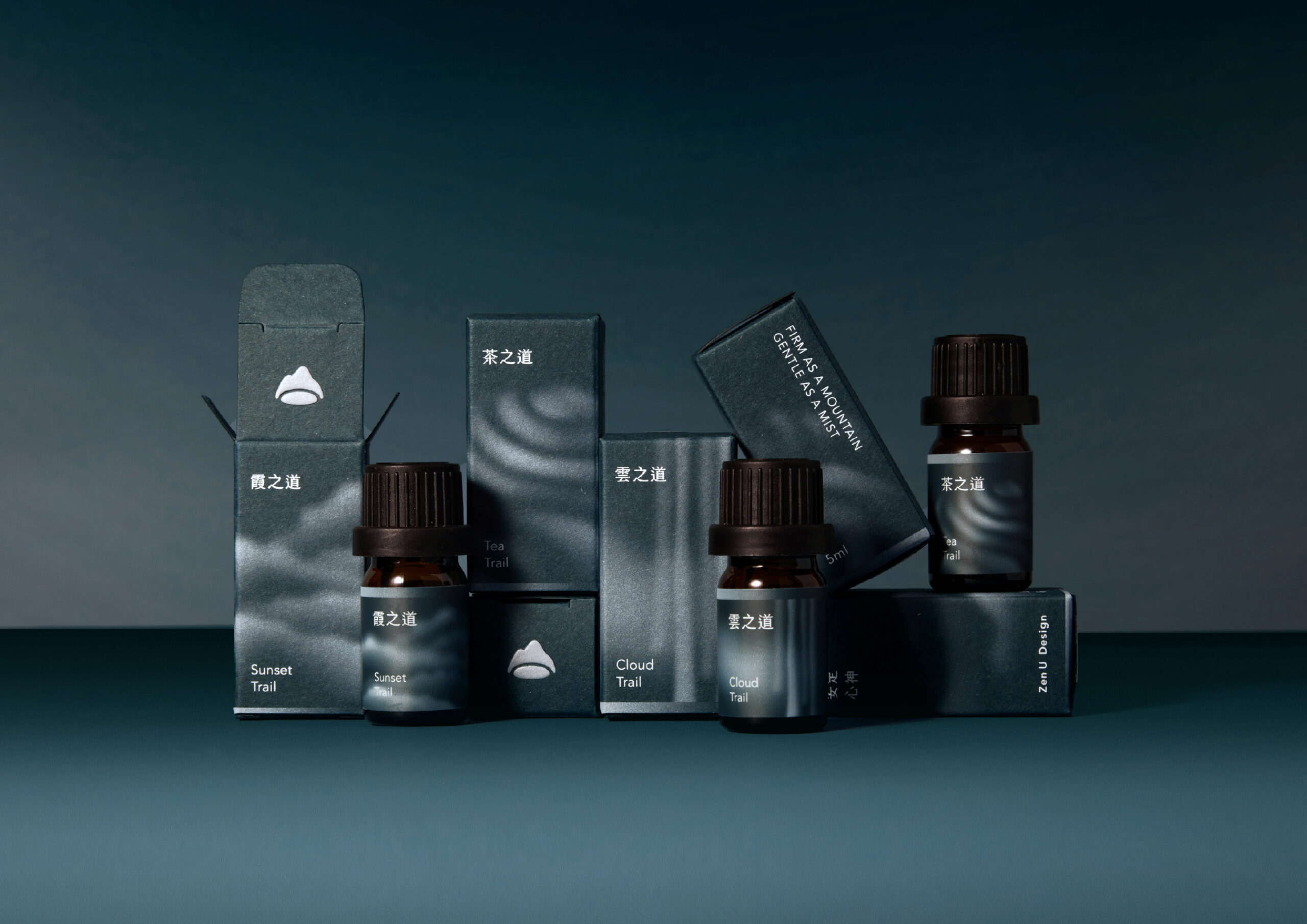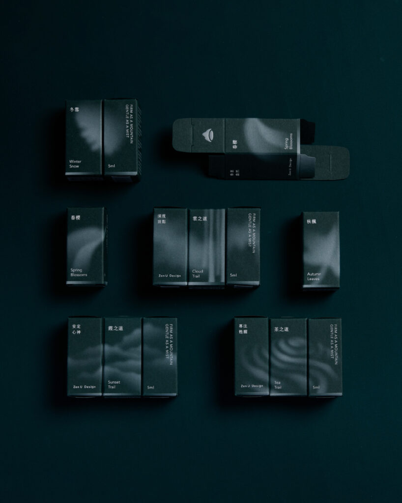 山霧每一款精油的調香,都是由創辦人親自走入山林,將當下感受到的氣味與氛圍,化為細膩且富含記憶的香氣作品。各品項包裝皆以深綠色為主調,呼應品牌源自於「山」的療癒理念,展現山林的沈靜與能量。而包裝上的圖形則延伸了香氣對應的自然意象符號,透過若隱若現的白色霧氣效果展現,呼應品牌名稱中的「霧」。兩者結合象徵香氛機啟動時釋放出的氤氳霧氣,營造出如山中霧氣般輕柔流動的療癒氛圍。