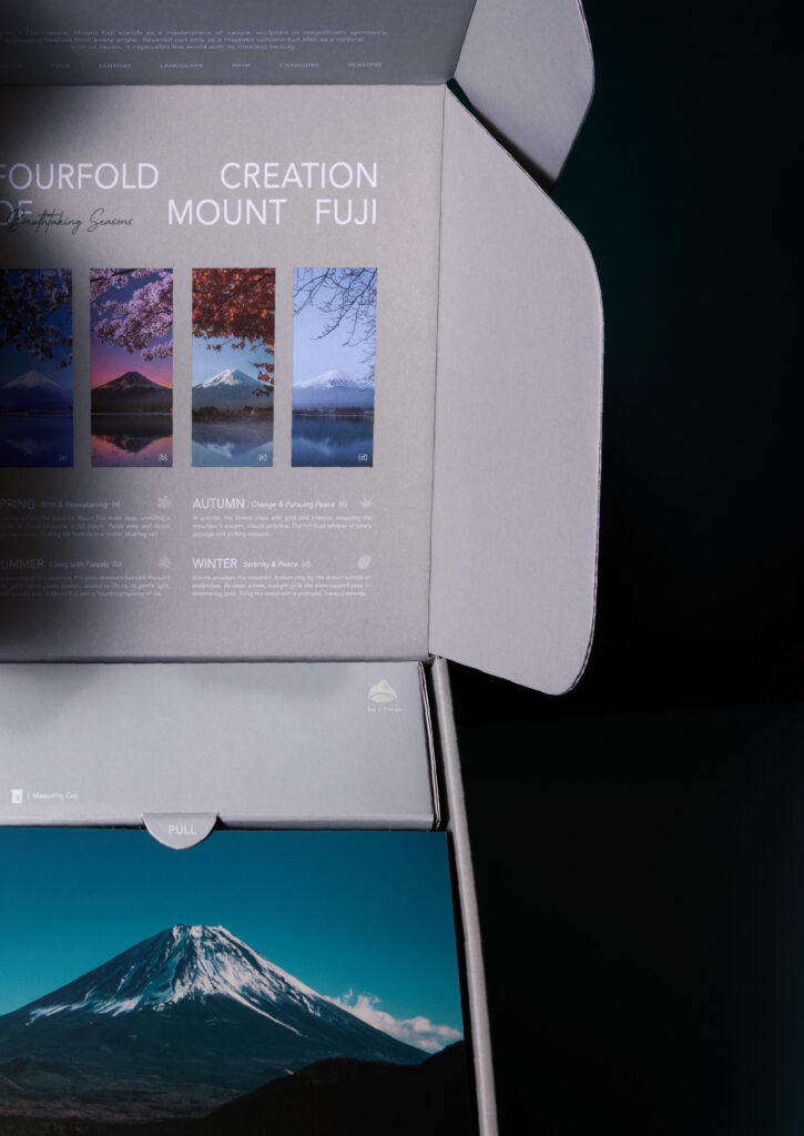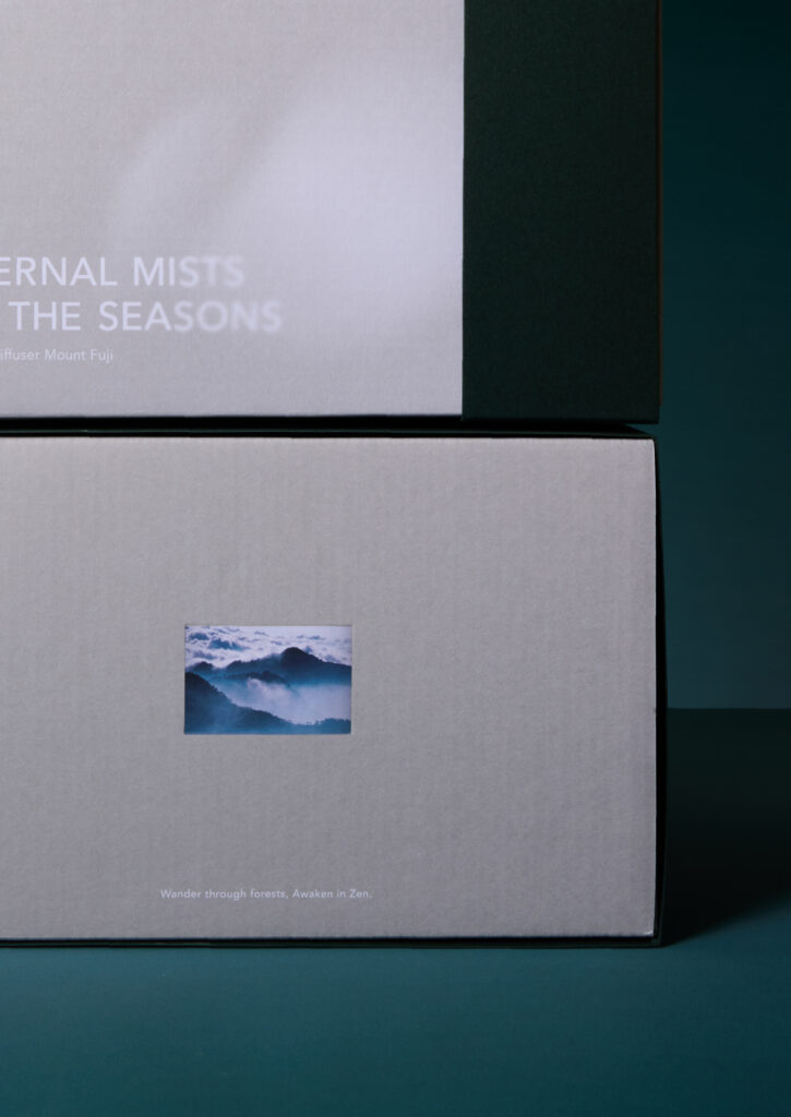香氛機禮盒除了運用香氣的符號外,側邊還搭配對應山體的風景照,彷彿一扇通往山林的窗景,靜靜開啟一段與自然相遇的旅程,讓迷人的山景悄然融入日常時光。打開盒蓋後,上蓋內側延伸不同山脈的獨特景色與底蘊,搭配對應的圖片與文字介紹,再結合山林的香氣交織,引領消費者沉浸於一段身心靈皆被療癒的山林之境。