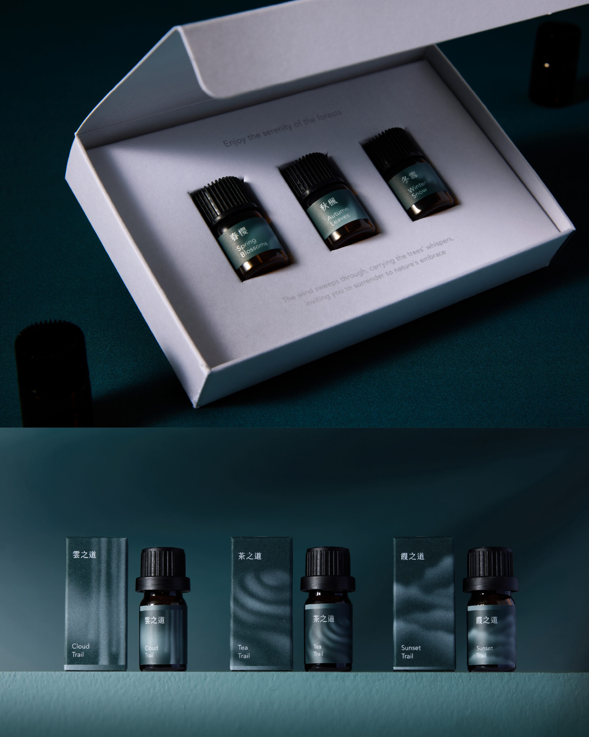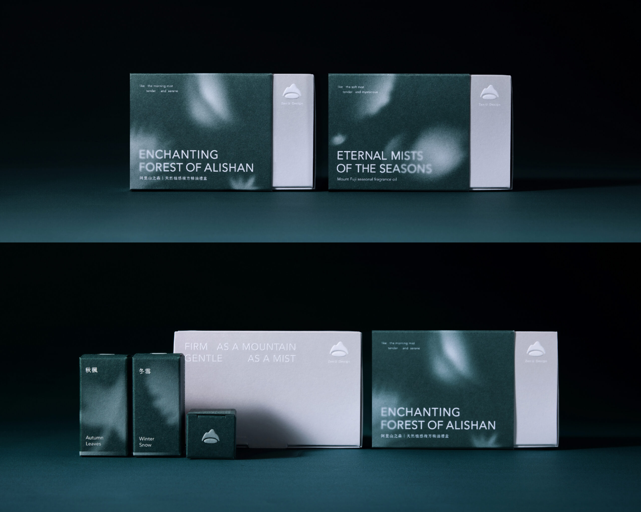 其他精油產品的包裝也延續相同的設計語彙與視覺脈絡,讓整體品牌風格高度一致。無論體驗哪一項產品,消費者都能感受到山霧所營造的溫柔情境,彷彿展開一場只屬於自己的靜謐山中旅程。