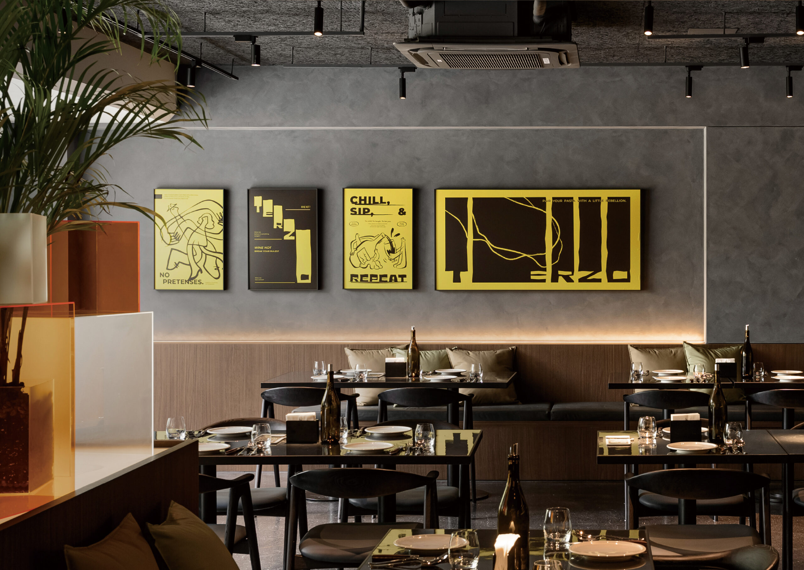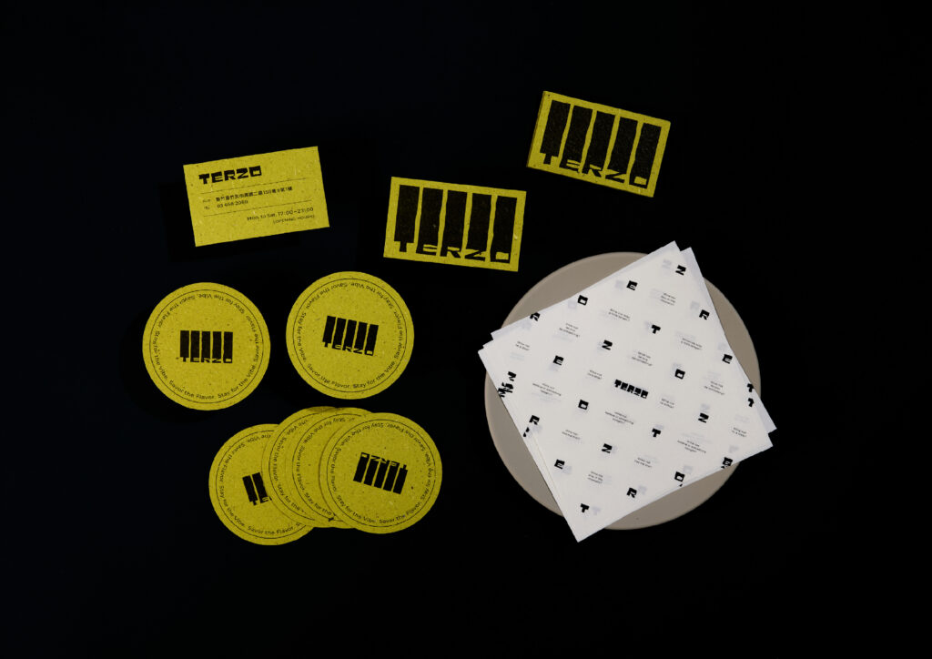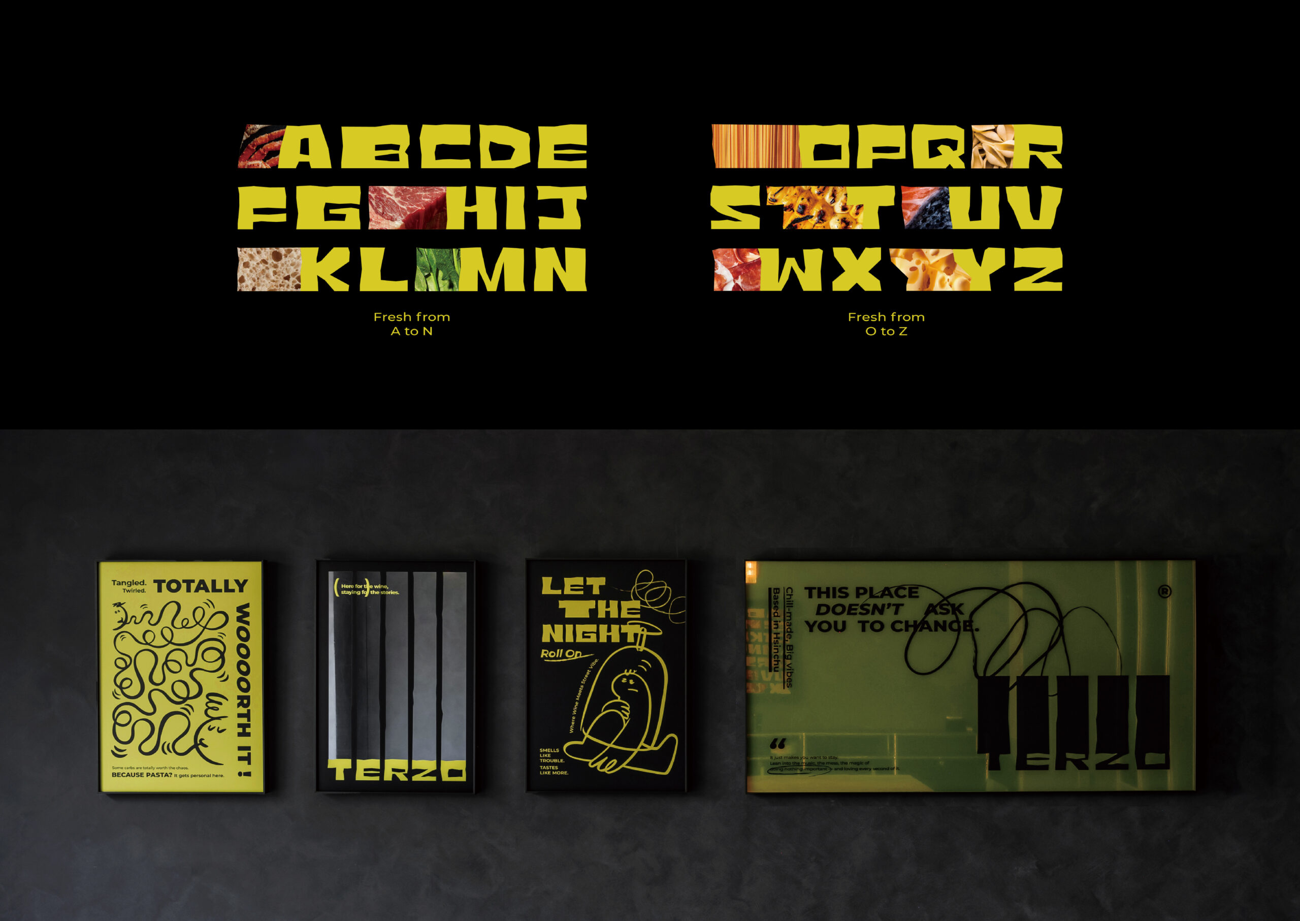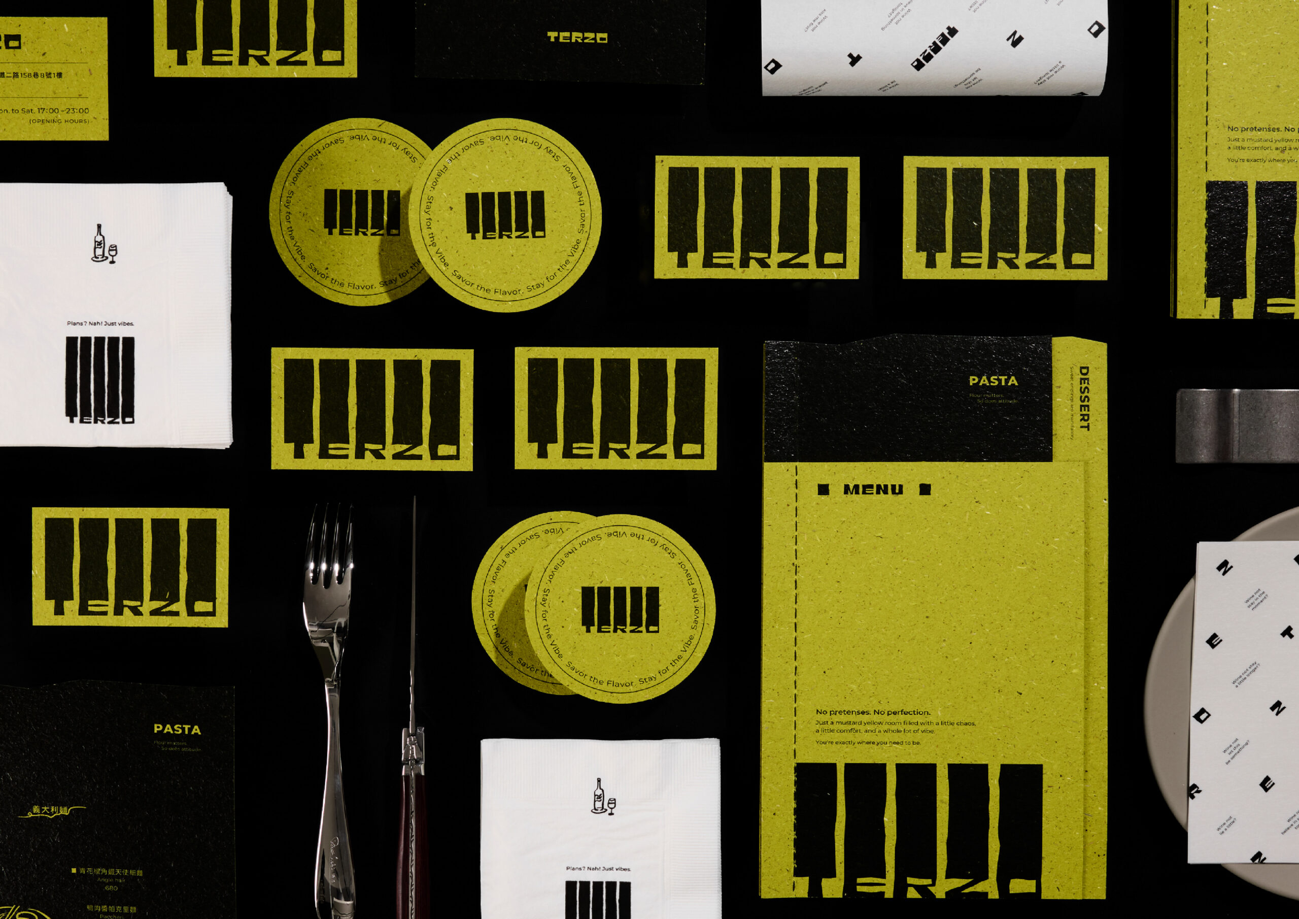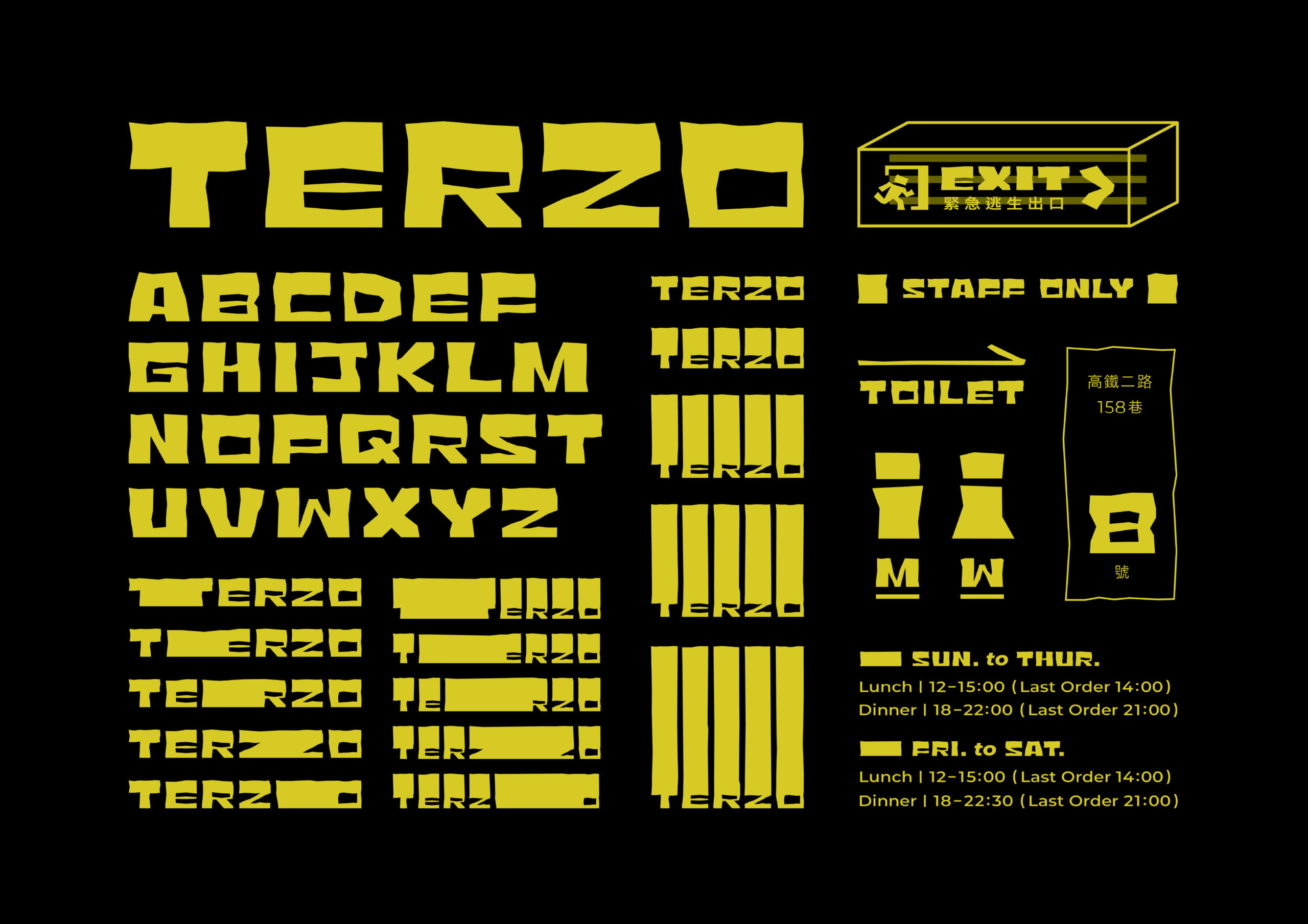 品牌標誌以具份量感的方塊字體,搭配略顯粗獷的邊緣線條,文字筆畫有著鮮明的粗細變化,部分筆畫可依應用情境拉伸延展,靈活融入各種情境與個性,象徵 Terzo 為每位訪客創造出專屬、獨特的用餐場域與體驗。這樣的識別系統,讓品牌即使僅以標誌為主視覺延伸至各個接觸點,仍能保有高度辨識度與風格一致性。